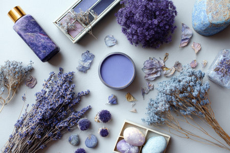 Lavender themed flat lay showcasing purple beauty products, dried flowers, and decorative items in a serene arrangement