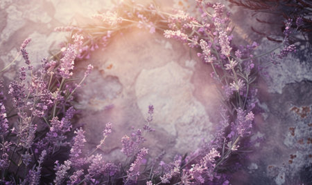 Stone background with wreath of lavender and space for text