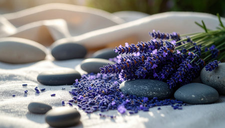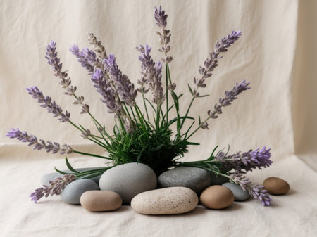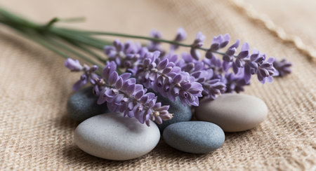 Crushed lavender sprigs and smooth river stones arranged on linen cloth create a serene spa ambiance, perfect for promoting relaxation and aromatherapy.