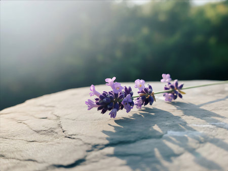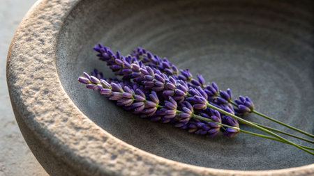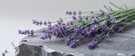 AI Generated. Lavender sprigs rest gently on textured gray stone surface