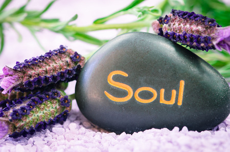 pink sea salt, lavender flower and black lava stone with words soul