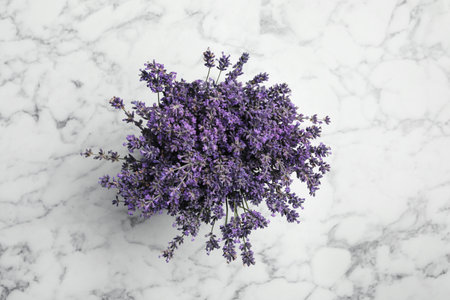Beautiful lavender bouquet on white marble table, top view