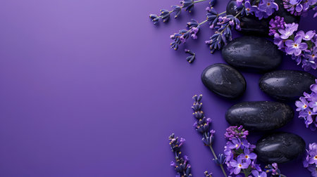Soothing Spa Arrangement with Dark Stones and Lavender Flowers on a Purple Background