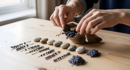 Hands carefully filling a small burlap sack with dried lavender flowers on a light wooden table. Rows of lavender stems and smooth stones are arranged neatly nearby, depicting a relaxing DIY aromatherapy or craft project.