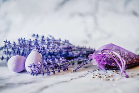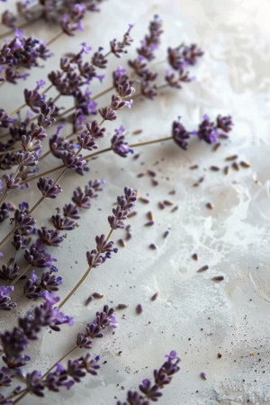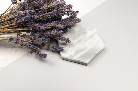 Freshly cut lavender adds a soothing touch to the elegant marble background creating tranquility.