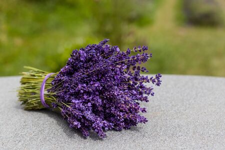 Fresh bunch violet lavender cut bouquet on a gray background