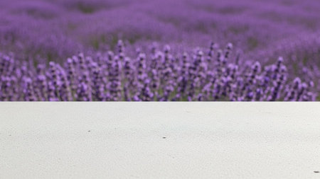 A close-up view of a white, textured surface occupies the foreground of the This surface is sharply in focus, revealing a fine, granular texture. In the background, a vast field of blooming lavender stretches out, its vibrant purple flowers rendered in a soft, blurred bokeh effect. The out-of-focus nature of the lavender creates a dreamy and serene atmosphere, contrasting with the sharp detail of the foreground. The evokes a sense of peace and tranquility, suggesting a pleasant sensory...