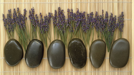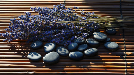 A beautiful composition featuring fresh lavender and smooth black stones resting on a bamboo mat, creating a tranquil ambiance perfect for relaxation and wellness themes.