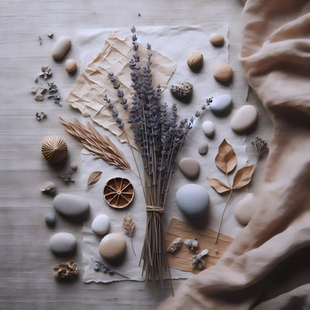AI Generated. Lavender Flowers and Smooth River Rocks on a Textured Linen Background