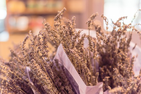 Dried lavender bouquet at local shop in Gainesville, Texas, America. Romantic flower in paper wrapper