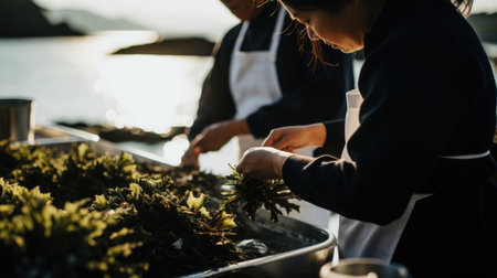 Local chefs selecting the finest seaweed from a fresh harvest, for a farm-to-table culinary experience.