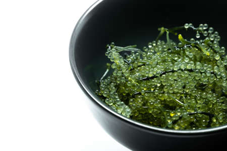 A close-up image of laver against a white background. Concept about healthy seaweed food ingredients.