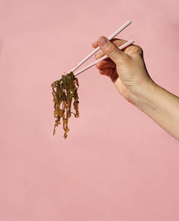 Female hand with crispy seaweed on the pink background with copy space. Dry nori sheets korean or japanese roasted food texture. Flat lay.