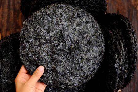 Top view group circle sheet dried black seaweed in basket, close up woman hand hold piece algae, healthy raw material for vegan cuisine, make many vegetarian food for diet, vegetable of sea