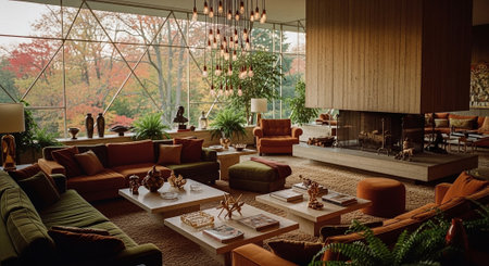 A spacious mid-century modern living room featuring wooden paneling, large windows, and a glass ceiling. The room has orange and green accents with comfortable seating and plants.