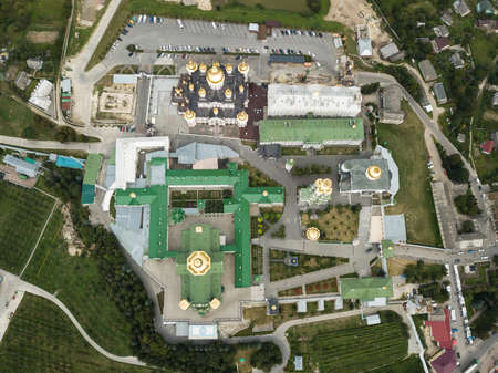 Aerial view to largest Orthodox church complex and monastery - The Dormition Pochayiv Lavra was founded on a mountain near the town of Novy Pochaev in 1240, Ukraine