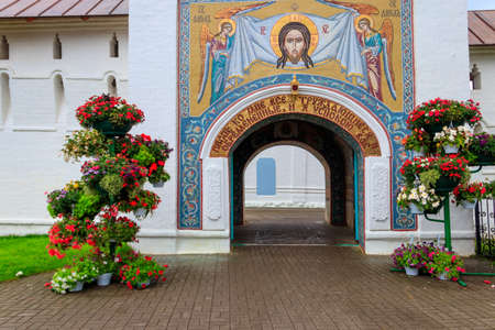 Yaroslavl, Russia - August 14, 2019: Tower at the entrance to Vvedensky Tolga convent in Yaroslavl, Russia