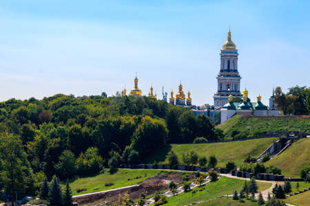 Temples, churches of Kyiv Pechersk Lavra, Kyiv, Ukraine. Sunny day. Historical and cultural reserve, historic architecture, downtown of Kyiv.