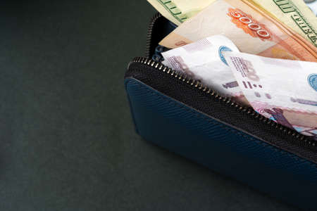 Bank notes Russian ruble cornish fabric background.Money and finance.Two thousandth and five thousandth denominations