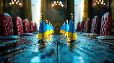This image showcases a luxurious conference room featuring Ukrainian flags elegantly arranged on a polished table, highlighting formal decor and rich ambiance.