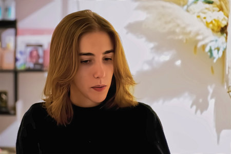 A woman with beautiful long blonde hair is gazing off to the side, her expression contemplative. Her features are highlighted by the soft light falling on her face.