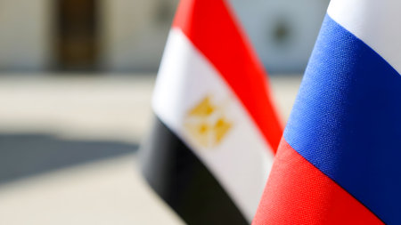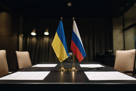 Flags of Russia and Ukraine on a dark meeting table suggest peace talks and conflict resolution, reflecting geopolitical challenges and potential cooperation.