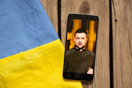 Ukraine Dnipro 01.04.2022 - President of Ukraine Volodymyr Zelensky on the screen of the phone and next to the flag of Ukraine, online news from the president on a smartphone at home