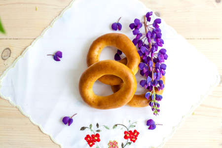 Sweet bagels and tender lupine flowers. Light composition with bright and purple flowers. A tender and romantic morning.