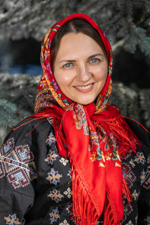 Russian folklore - a woman in a bright shawl standing outdoors in the winter forest - outdoor