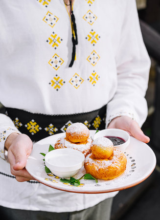 Close-up of a person in ethnic costume serving local sweet pastries with dipping sauces