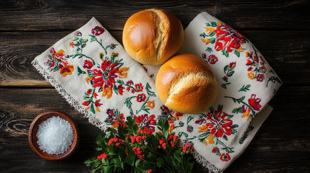 Two freshly baked bread rolls rest on an intricately embroidered cloth, accompanied by salt and greenery, showcasing rustic culinary aesthetics and warm home cooking.