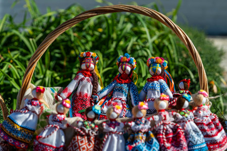 Dolls wearing ethnic ukrainian traditional embroidered costumes, vyshyvanka - traditional embroidered clothes on flea market or national festival. Vintage goods on flea market. Symbol of Ukrainian culture