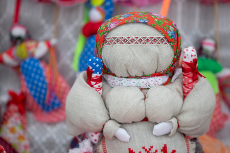 Close-up of a traditional amulet doll for sale to tourists at a street market in Kyiv, Ukraine. Ukrainian motanka dolls