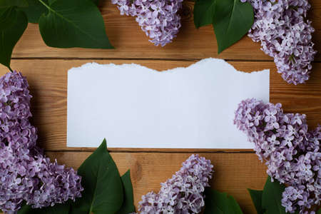 paper with flowers on a wooden background, there is free space for text, a festive flat layer