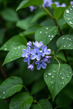 Close up of purple lilac flowers with water beads