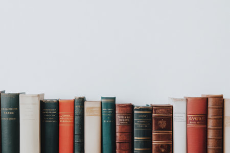 A collection of books showcases various genres, each lined up perfectly against a bright white background, inviting exploration and reading.