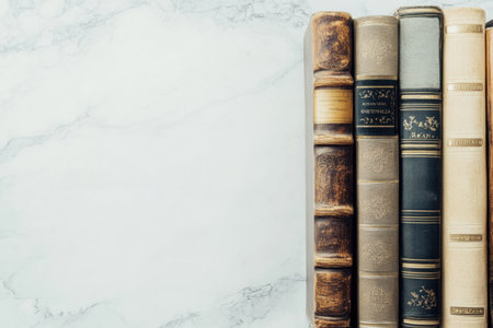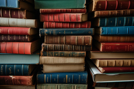 A captivating arrangement of vintage leather-bound books stacked elegantly in a grand library. This image evokes a sense of scholarly pursuit and timeless knowledge.