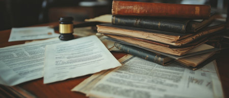 Textured legal documents with a gavel on a wooden table showcasing intricate details