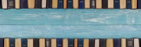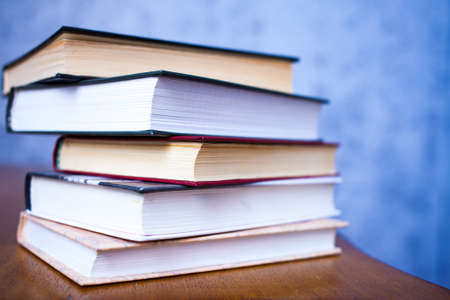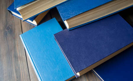 Lots of blue books on a wooden table. On a wooden background are books with a blue cover. Blue book cover.