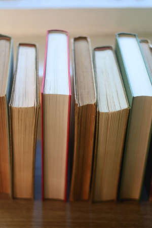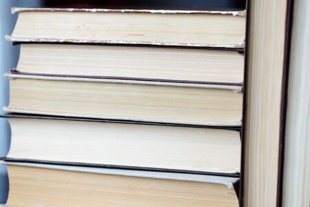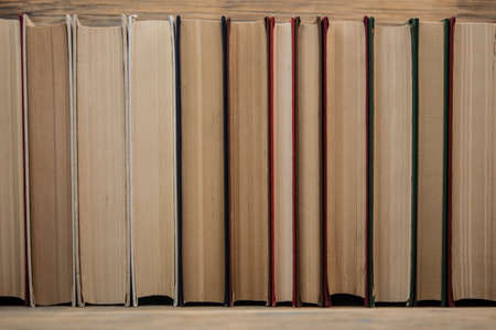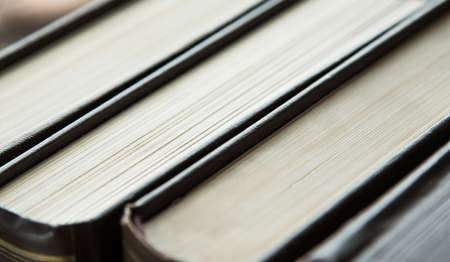 Old vintage yellowed pages of books stand in rough texture side view wide abstract rough texture background, material close-up. Literary reading, educational knowledge
