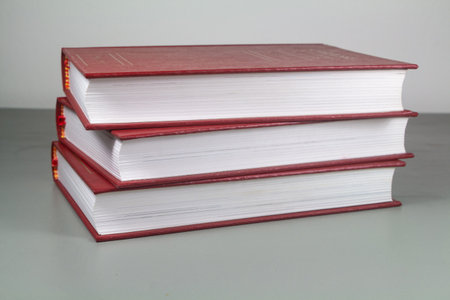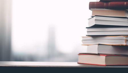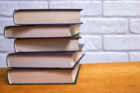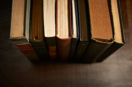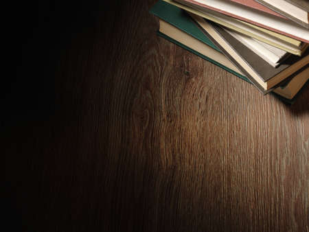 Pile of hardcover books stacked on top of one another in a shadowy room on a wooden desk with copyspace in the foreground