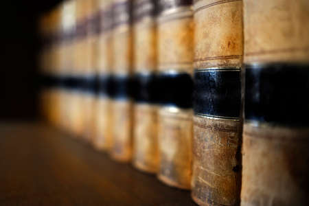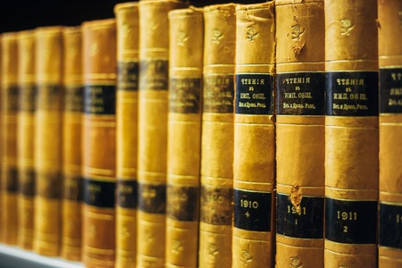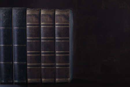 Antique leather cover books on wooden bookshelf in university public library. Reading philosophy or history studying. Education research and self learning concepts