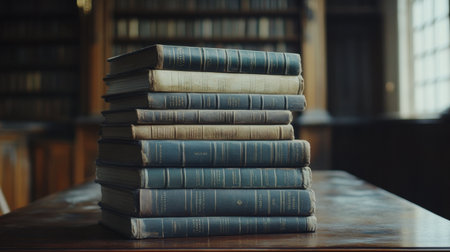 A serene composition showcasing a stack of vintage leather-bound books on a polished wooden table in a historic library. Perfect for themes of knowledge and nostalgia.