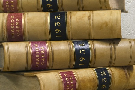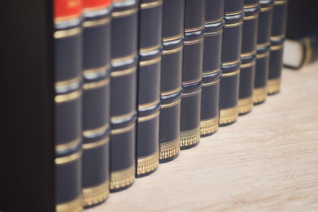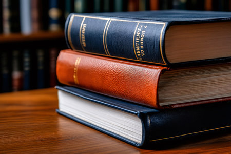 A close-up of three vintage leather bound law books stacked on a wooden table in a classic library setting, evoking a sense of history and knowledge.