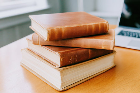 Leather bound books stacked on a wooden table in a library, creating a scholarly atmosphere