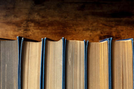 Bunch of vintage hardcover books on wooden background. Selective focus.