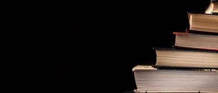 Several volumes of books lie on the dark table. Copy space. Concept of leisure and reading. Top view