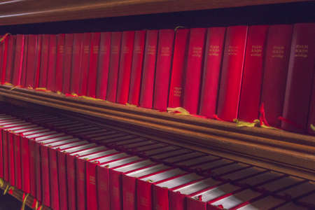 Uppsala, Sweden - 16 June 2019: Lots of red Bibles for the congregation of the Catholic Church. Hymnals and prayer books. Details of interior of Uppsala Cathedral.