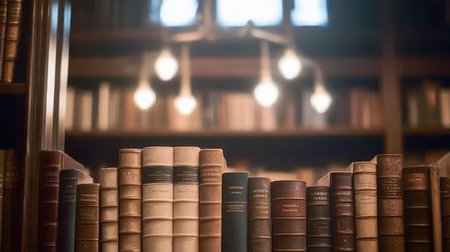 leather bound book spines with embossed titles, shallow focus for moody ambiance