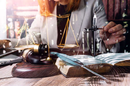 Business and lawyers discussing contract papers with brass scale on desk in office. Law, legal services, advice, justice and law concept picture with film grain effect